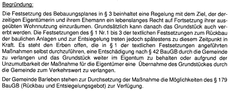 Nur sehen die Dinge in Wirklichkeit ganz anders aus. Die Familien G und S werden sich in der Grundstücks- angelegenheit nicht einig. Dadurch will Familie G ihr Haus-Grundstück auch nicht mehr verkaufen. Ungeachtet dessen hält jedoch die Gemeinde weiter an ihren Plänen fest und droht der Familie G mit Enteignung. Zu diesem Zweck wurde im Bebauungsplan Nr. 34 festgesetzt, dass der Übergang des Wohnhauses an die folgende Generation generell ausgeschlossen wird. Die Erben sollen gezwungen werden, das Haus dann selbst abzureißen (4*). Da das sicher sehr teuer ist, möge man doch gleich an die Gemeinde verkaufen! Auch damit Bürgermeister Keindorff nicht Willkür oder Eigennutz unterstellt wird (eines seiner eigenen, bebaubaren Grundstücke erhielte dadurch eine neue Zuwegung von der Rothenseer Str.), wurde dem Gemeinderat ein B-Planentwurf mit den genannten Absichten vorgelegt.